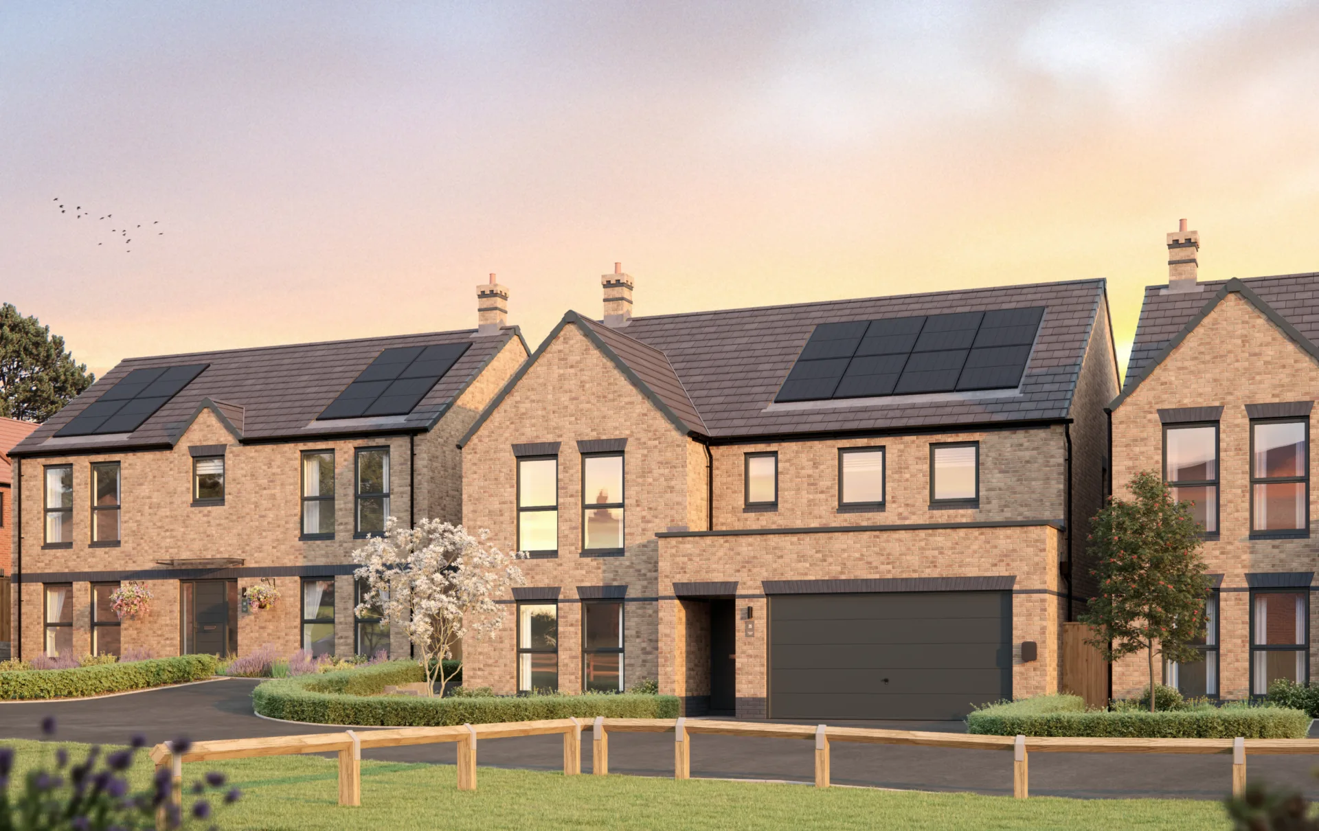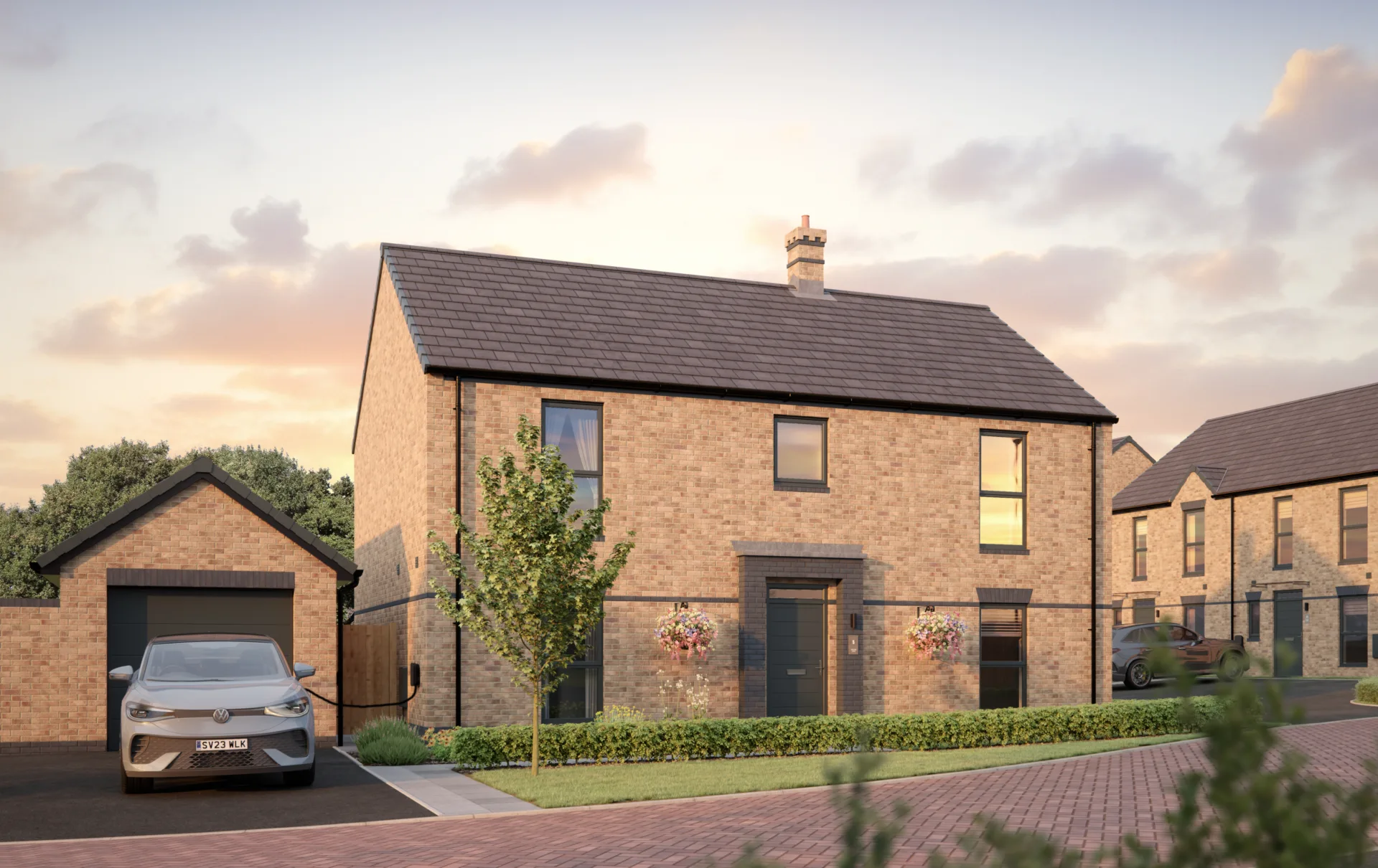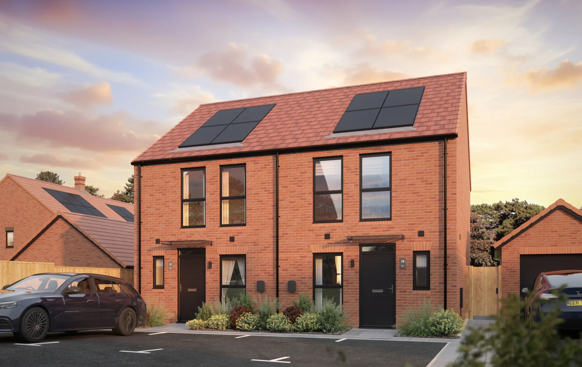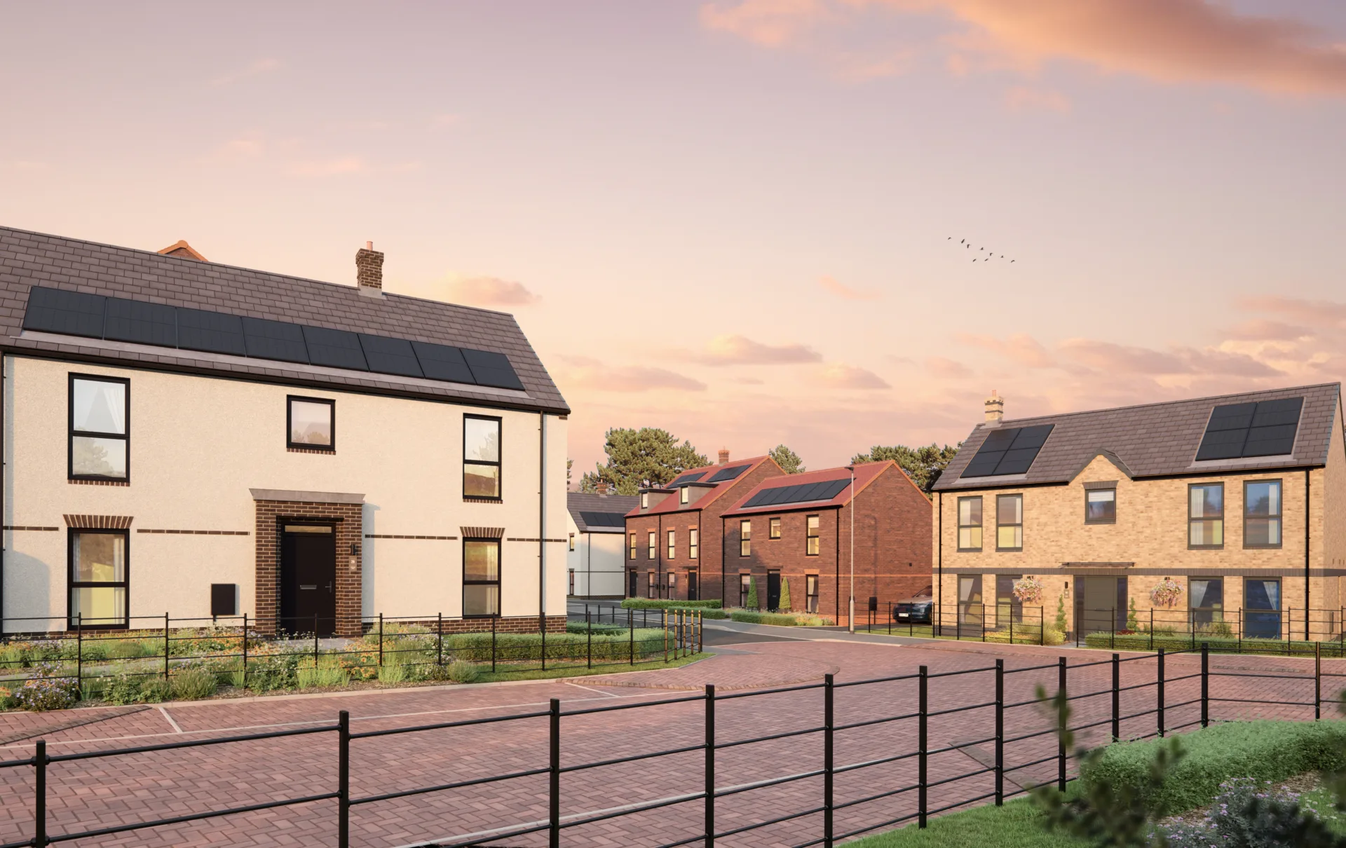 A carefully balanced palette of materials – including red brick, chalk white render, and varied roof tiles – brings depth to the street scenes, ensuring each home at Clarendon has a distinctive visual identity.